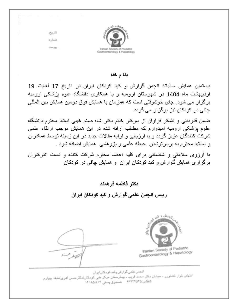 بیستمین همایش سالیانه انجمن گوارش و کبد کودکان ایران درتاریخ 17 لغایت 19 اردیبهشت ماه 1404 در شهر ارومیه و با همکاری دانشگاه علوم پزشکی ارومیه برگزار می شود. جای خوشوقتی است که همزمان با همایش فوق، دومین همایش بین المللی چاقی در کودکان نیز برگزار می گردد. ضمن قدر دانی و تشکر فراوان از سرکار خانم دکتر شاهصنم غیبی استاد دانشگاه علوم پزشکی ارومیه امیدواریم که مطالب ارائه شده در این همایش موجب ارتقاء علمی دانسته های شرکت کنندگان عزیز گردد و با ارزیابی و ارائه مقالات جدید در این زمینه توسط همکاران و اساتید محترم به پربار شدن مسائل علمی و پژوهشی همایش افزوده گردد. با آرزوی سلامتی و شادمانی برای کلیه اعضای محترم، شرکت کنندگان و دست اندرکاران برگزاری همایش گوارش و کبد کودکان ایران و همایش چاقی کودکان.